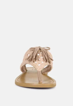 The Classic summer Thong flats with 100% Natural cotton woven structure with soft suede frame detail and the tassels at the top. The round toe open slides are casual, comfort shoes from Rag & Co.