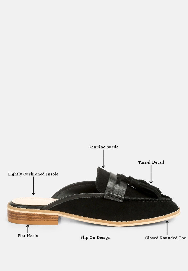 Chic and comfortable, the only two things you need in a shoe which is versatile and appropriate for all occasions. This pair comes with a low wooden heel and tassle detailing and mock stitch detail, which provides an rich dimension to the mules. It is slip on and includes a leather collar lining for extended comfort and luxe look.