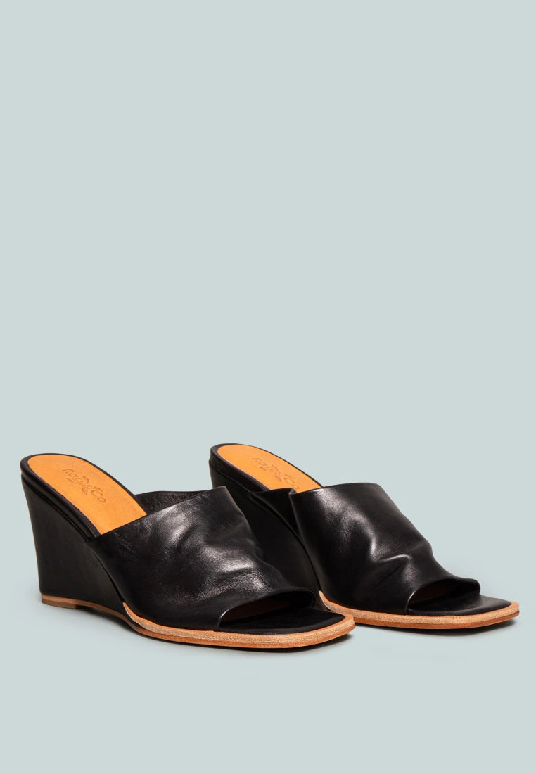Sliders Wedge Heels in square cut open toe. The wedge heel is crafted in genuine soft leather; is highlighted by contrast frame. Promising you comfort and grace, the minimal sandal from Rag & Co. X is feet favorite.