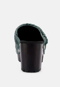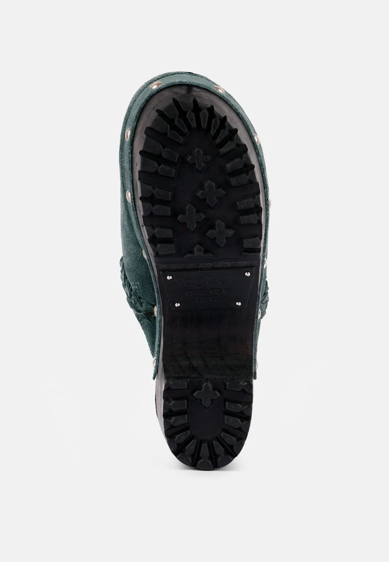 Set on black wood, the beautiful seaweed green genuine suede leather clogs sandals in mid heel is worth every dollar! It has a beautiful braided detail on top and metallic stud lined along the ramp. The lining is constructed in organic cotton fabric which breathes! It has padded insole which cuts strain and relaxes the feet.