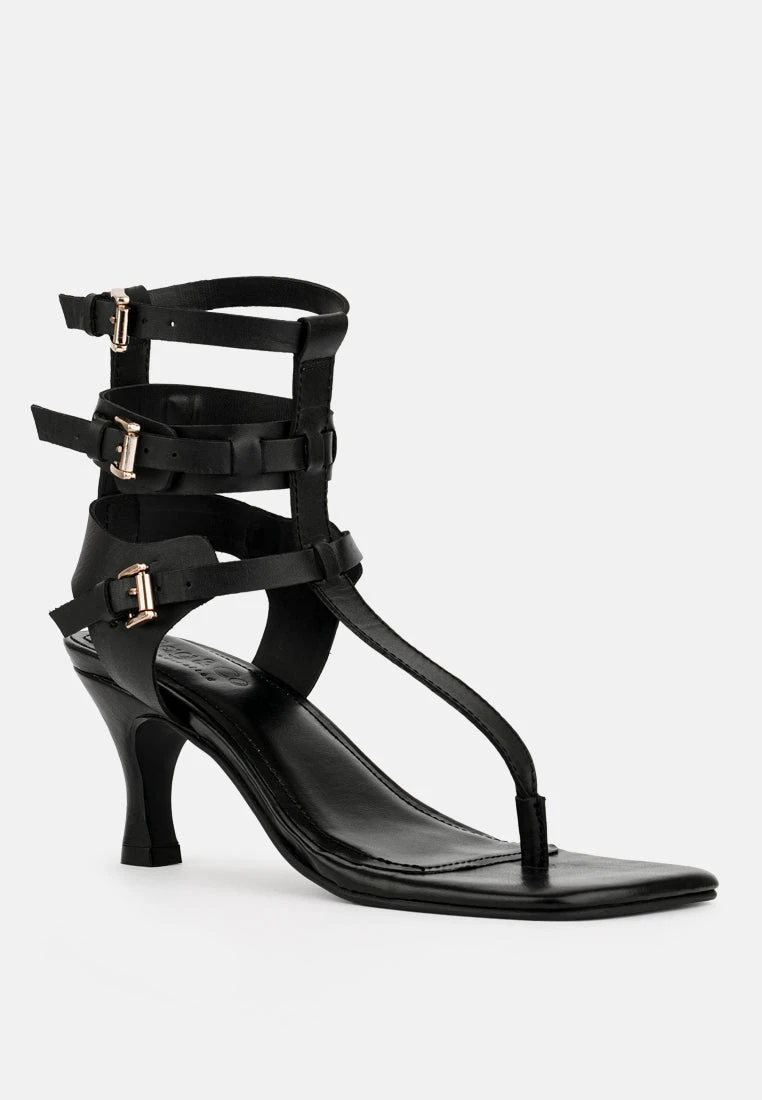 Buckled thong sandals, which wrap the ankle in style – have metallic pin buckle details which add to the look and accessibility. The cut out style sandal has open toe and heel and looks stylish on feet with little kitten heels.