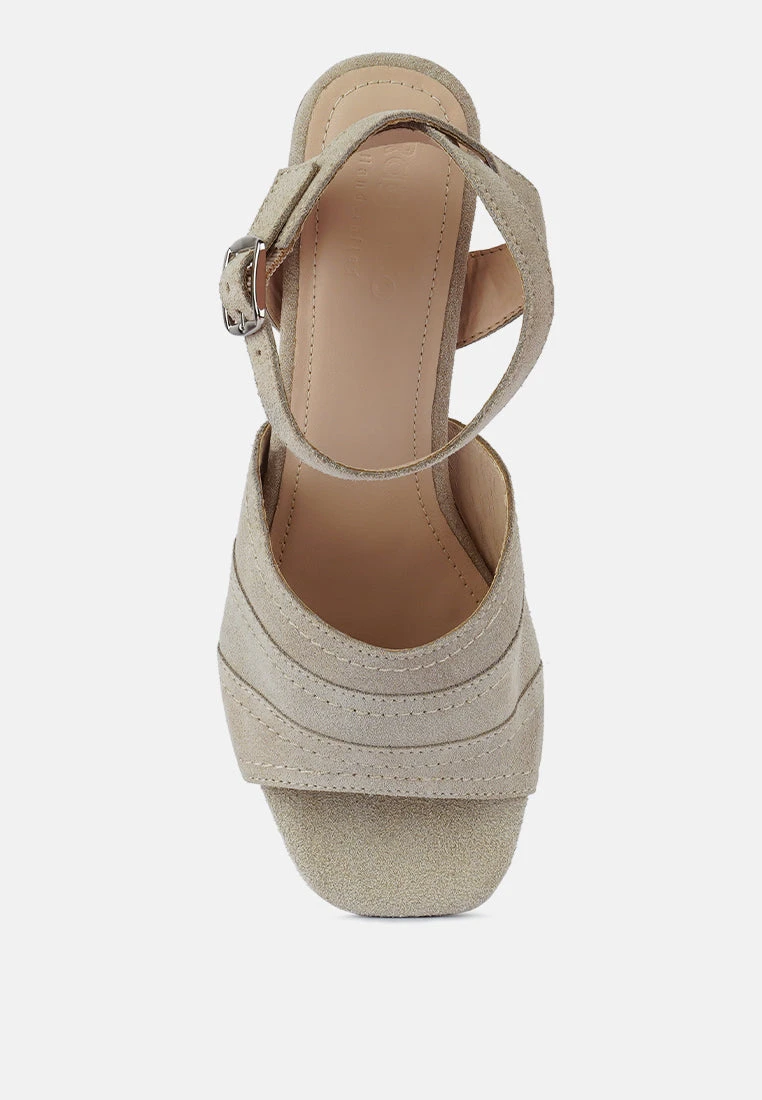 Solid Nude Soft Suede block heeled sandal with quality hardware – the pin buckle fastening sandal is a summer staple. Is a basic high heel ‘comfort’ shoe handcrafted with fine suede. The squared toe sandal has padded insole which keeps feet at rest.