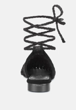 TUTSI Black Handwoven Honeycomb Tie Up Flat Mules